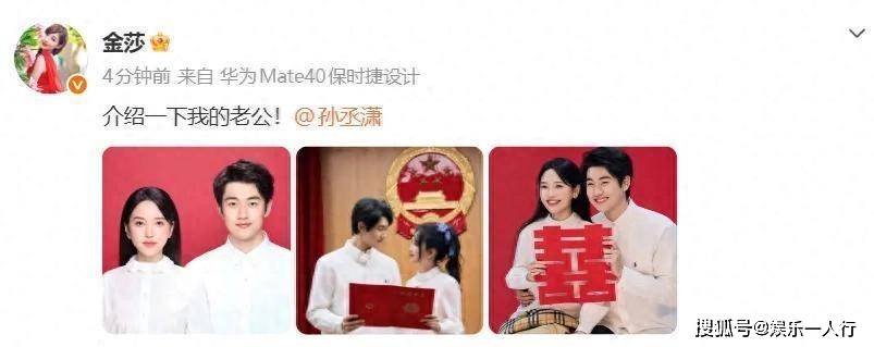 2026年4月9日,金莎在微博上发了一张红底结婚照,配文很简单:“介绍一下我的老公。”几乎同时,孙丞潇的微博也更新了:“介绍一下我的老婆。”没有长篇大论的告白,没有精心设计的官宣文案,就是这种直白到有点可爱的宣告。根据晒出的结婚证信息,两人其实早在2026年2月13日,也就是情人节前一天,就已经在北京海淀区民政局登记结婚了。