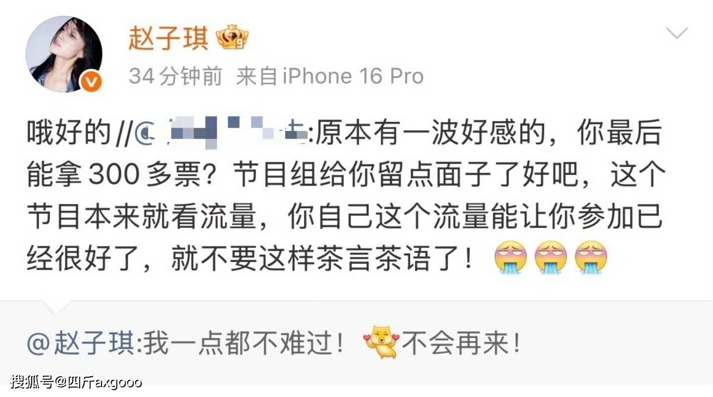 孙怡输给阚清子,网上骂声一片,所有人都觉得离谱;现在连赵子琪这样,全程认真对待舞台、没划水没假唱的姐姐,都被淘汰了。