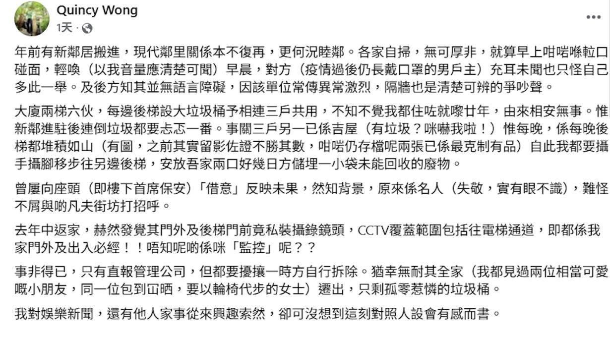 王利民除了公开隔壁装监控之外,还称这一家人搬进来之后,对待邻居态度冷漠,自己主动打招呼,对方充耳不闻。他一度还以为对方有语言障碍,后来经常听到隔壁有激烈的争吵时,声音有男有女,才知道原来这一家人并没有这方面的问题,显然王利民就是在反讽李泳汉一家。此外,王利民还透露这一家人还有一个需要轮椅代步的女士,不过每次见到都是包头包脚,不轻易让人见到,而这个女士就是施明。王利民想要表达的就是,李泳汉对施明的出入非常保密,就是不想被外人看到。