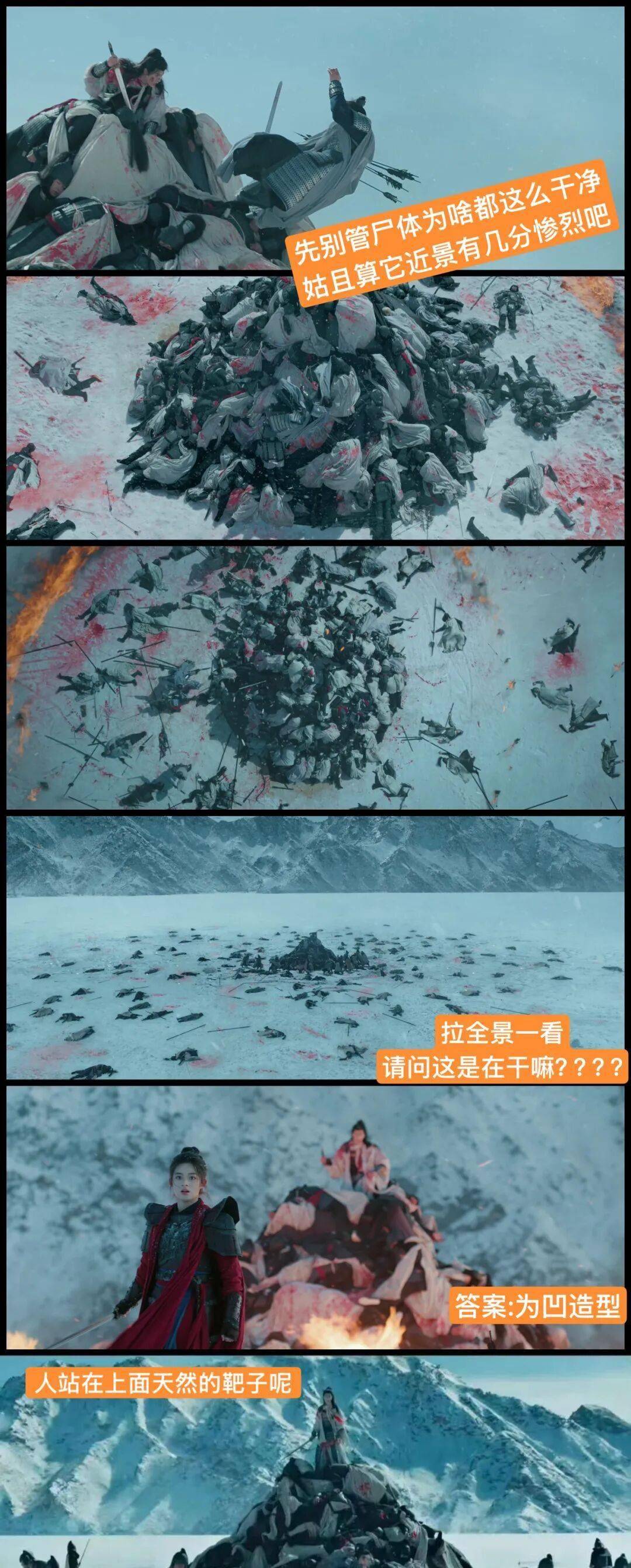 所以是的,最糟糕的是这位既不会叙事也不会拍表演更在镜头美感上一路跑偏的导演侣皓吉吉。如果你看过他的雄作《江湖夜雨十年灯》,恭喜你,还能更差。大哥在《冰湖重生》开篇就学《权力的游戏》私生子之战搞尸山血海,真给我整笑了。人家那是战场空间有限+人山人海肉搏造成的,密集度合乎逻辑地营造出十足惨烈的尸山血海,你偌大一个冰湖就十几个人堆个尸山凹造型搞什么装置艺术呢?怕敌人瞄不准自己呗?