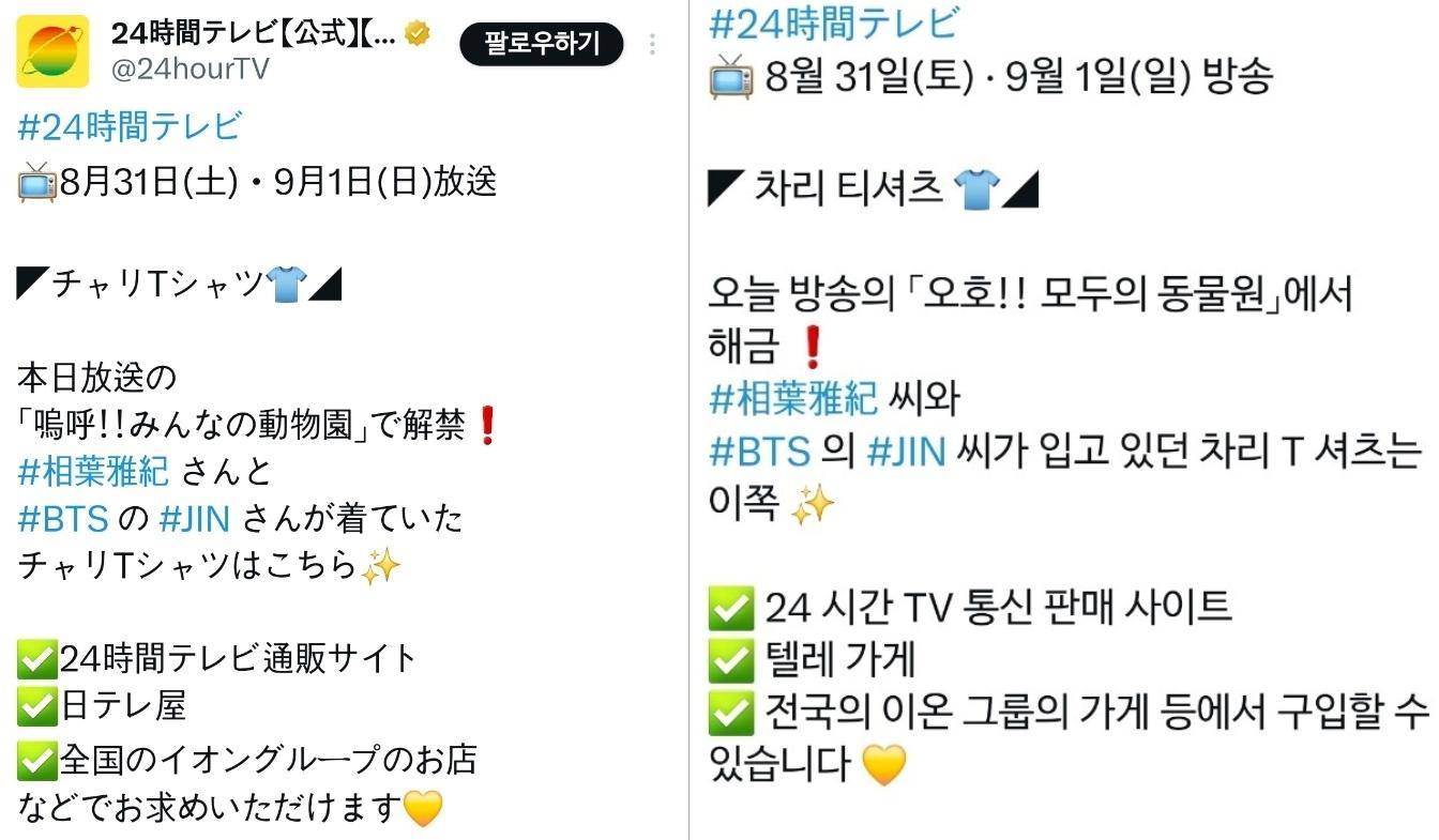 防弹少年团金硕珍,将出现在日本“日本电视台”,每年夏季8月31日至9月1日播出的著名大型慈善节目“24小时电视”中,国际顶级巨星金硕珍将出演热门节目《24小时电视》的《大家的动物园》,出演者所穿T恤的设计每年都会发生变化,其销售收入将被捐赠。