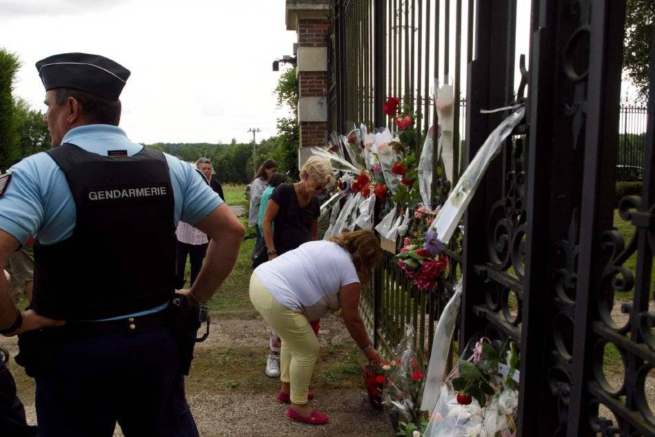 当地时间2024年8月18日,法国中部杜西镇的拉布鲁里庄园前,民众纷纷献上鲜花,向已故法国著名演员阿兰·德龙致敬。