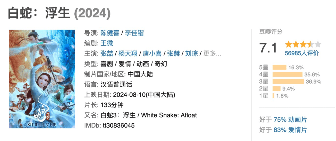 同样是上周新上映的院线片,来自微光的《白蛇:浮生》,评价同样也还可以。