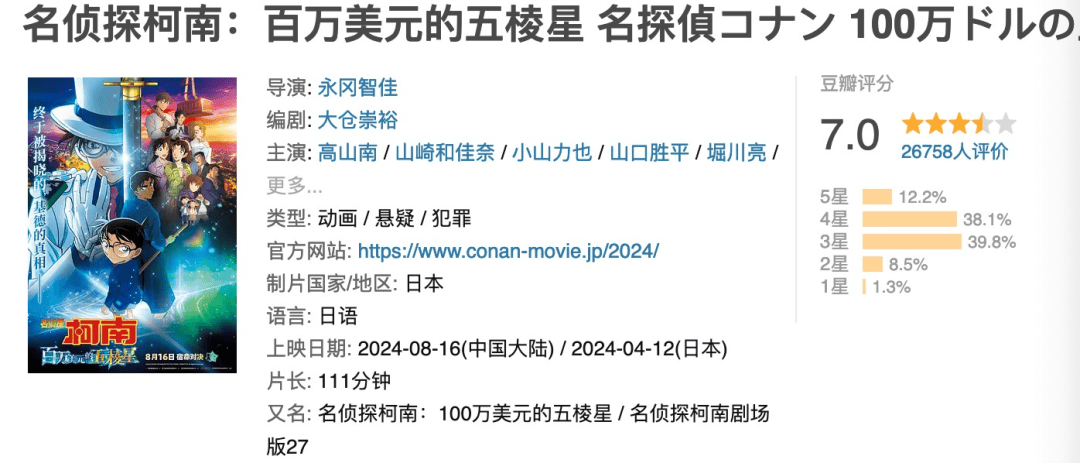 最新的柯南剧场版,也是上周上映的,评价还行,所以也上榜了。