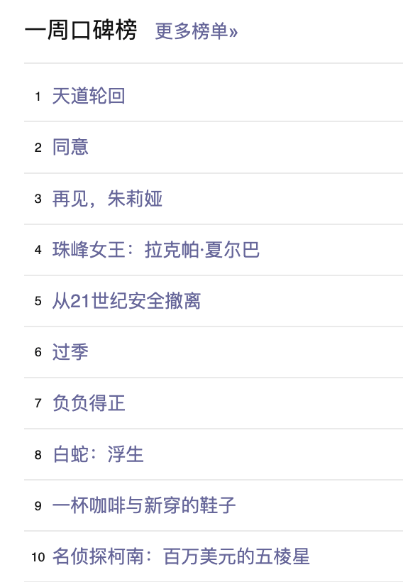 最后,还是例行附上一周豆瓣口碑榜的完整榜单: