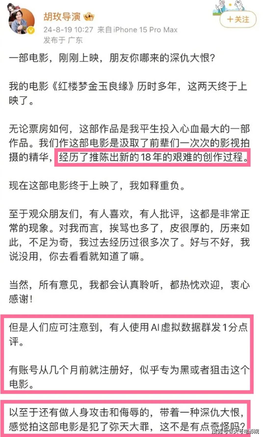 同时,胡玫导演痛斥有黑粉,她称:“有人使用AI虚拟数据群发1分点评”。