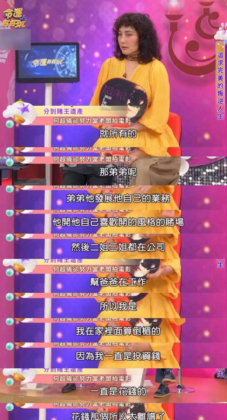 何超仪透露姐姐何超琼接管了父亲的产业,所有的都是她在掌管,两个姐姐何超凤和何超蕸也在帮助赌王做事,而弟弟发展自己喜欢的博彩行业。她自己因为在演戏,所以也是一直在投资,一直在花钱,她没有为家族产业做出贡献。
