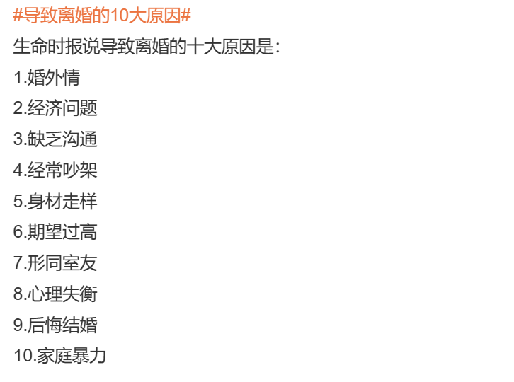 凑着热度,有相关媒体列举出了导致离婚的十大原因。