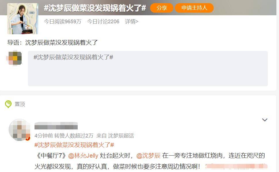 在节目播出之后,“沈梦辰做菜没发下你锅着火了”冲上热搜,而且话题非常爆火。