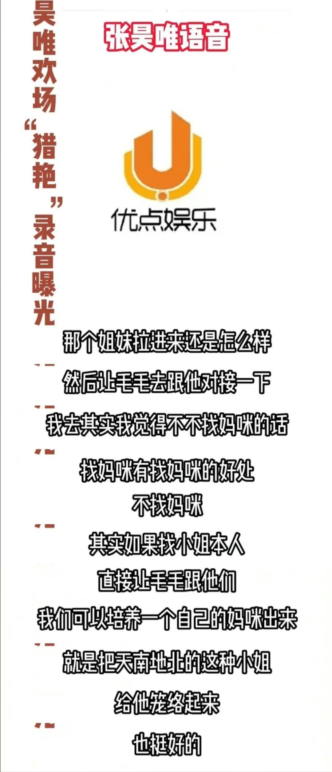 张昊唯今天出来回应了,说自己这事是因为和发小反目成仇,他被团伙敲诈,发小坑害他伪造了聊天记录,现在自己跟发小自己和解了,文后附上了发小手写信向张昊唯道歉,对方保证不再继续爆料,最后说自己会暂时退圈去维权。七七八八说了一堆,意思就是说自己无辜。大家相信吗,反正圈圈是不相信。按他这话说的,自己都要退圈没工作了,还会接受一个害自己丢饭碗的发小道歉?而且就算对方真伪造了聊天几句,但录音是真的呀,扬言要开抱月楼也是他亲口说的,跟聊天记录也都对的上,现在叫屈,稍微搞笑了点。这一系列都是公关流程罢了,选一个大家都忘得差不多的时间,然后一股脑的把重点澄清一下,也不用件件都澄清,就直接说一句发小陷害就行了。张昊唯这是被资本放弃了,事情曝光以后他那边的工作就全停了,所以也不存在主动退圈这个说法,本来就没戏拍了。确实也有发小这么个人,聊天记录也是跟他的,但对方是不是伪造聊天记录这个大家懂得都懂哈,对方反正也是为了钱,钱拿到了就够了。这事大动干戈再公关一次,是为了让这件事就到张昊唯为止,让网友别再扒他身后的大哥还有公司,他会说出要开抱月楼也是因为圈里有这个需求,既然是见不得光的需求,肯定不能被曝光了,就那么回事吧,这个人只要替他们做好这事以后还能干幕后,不至于被封杀。
