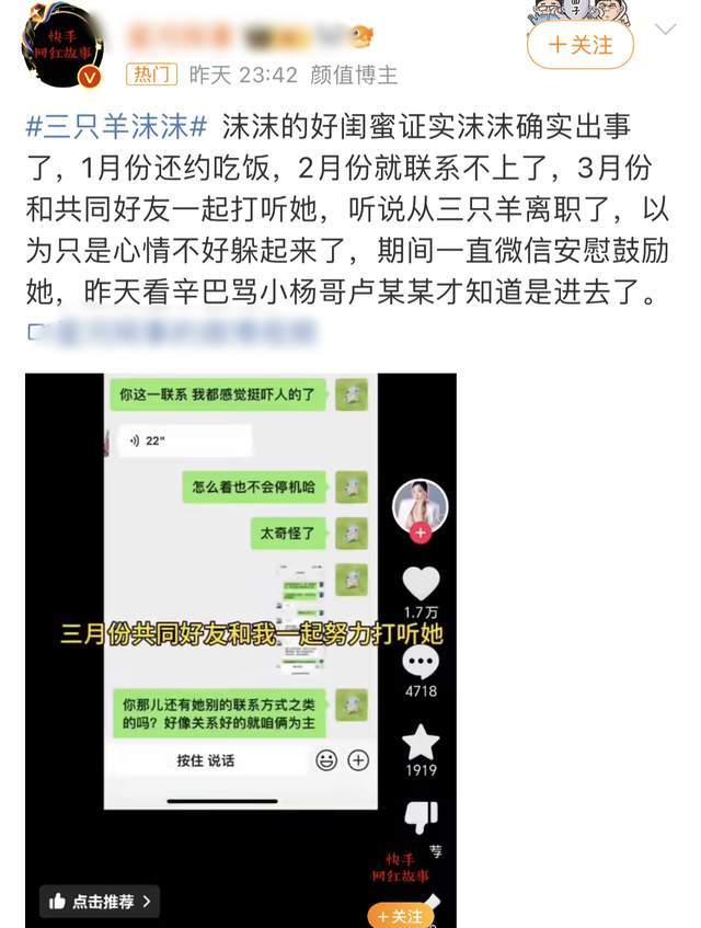 辛巴与三只羊的“大闸蟹”风波,牵扯出三只羊沫沫,由于她本人已经断更9个月,且辛巴曝料卢文庆曾送进去一个小女孩,所以矛头全部指向了三只羊沫沫。