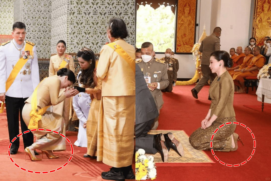 对比前总理英拉行跪礼,为保持一个姿势,全身都在发力,还特地脱下了高跟鞋↓