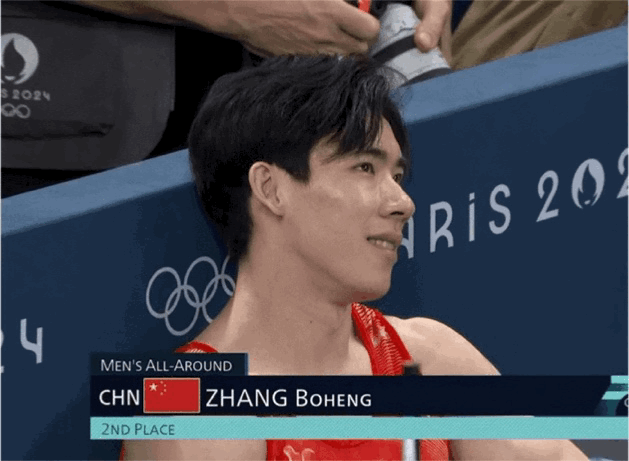周雨彤那条团建博第一张图拍到了后面的大屏,大屏上好巧不巧正是运动员张博恒因被压分而错失金牌在台上苦笑的画面。