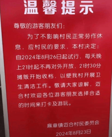 此前当地网友发布的一张迈合村村委会通知显示,为了不影响村民正常劳作休息,应村民的要求,自2024年8月26日起试行,每天晚上21时起不再对外开放,21时30分摊贩开始收档,以便该村开展卫生清洁工作。