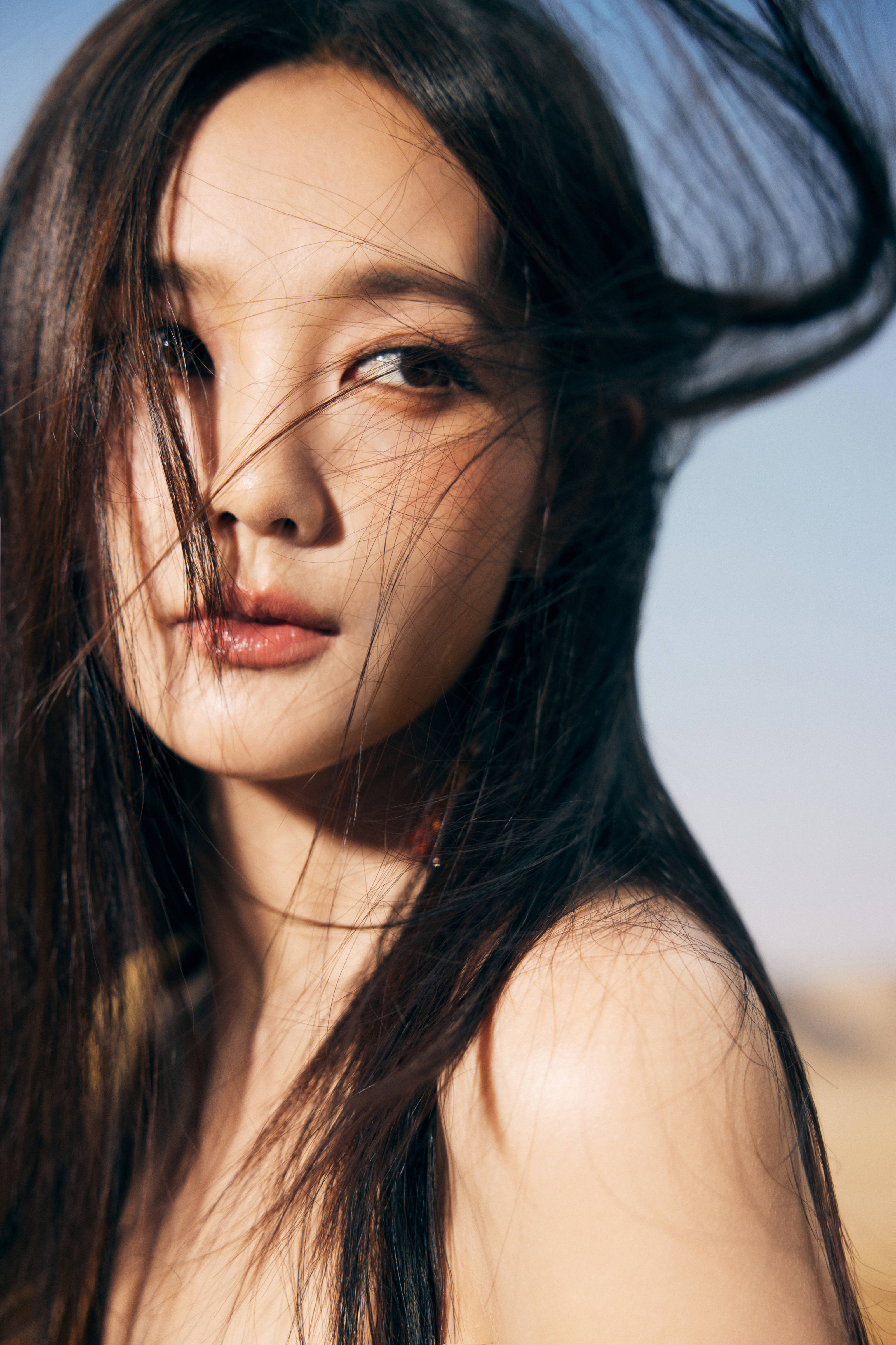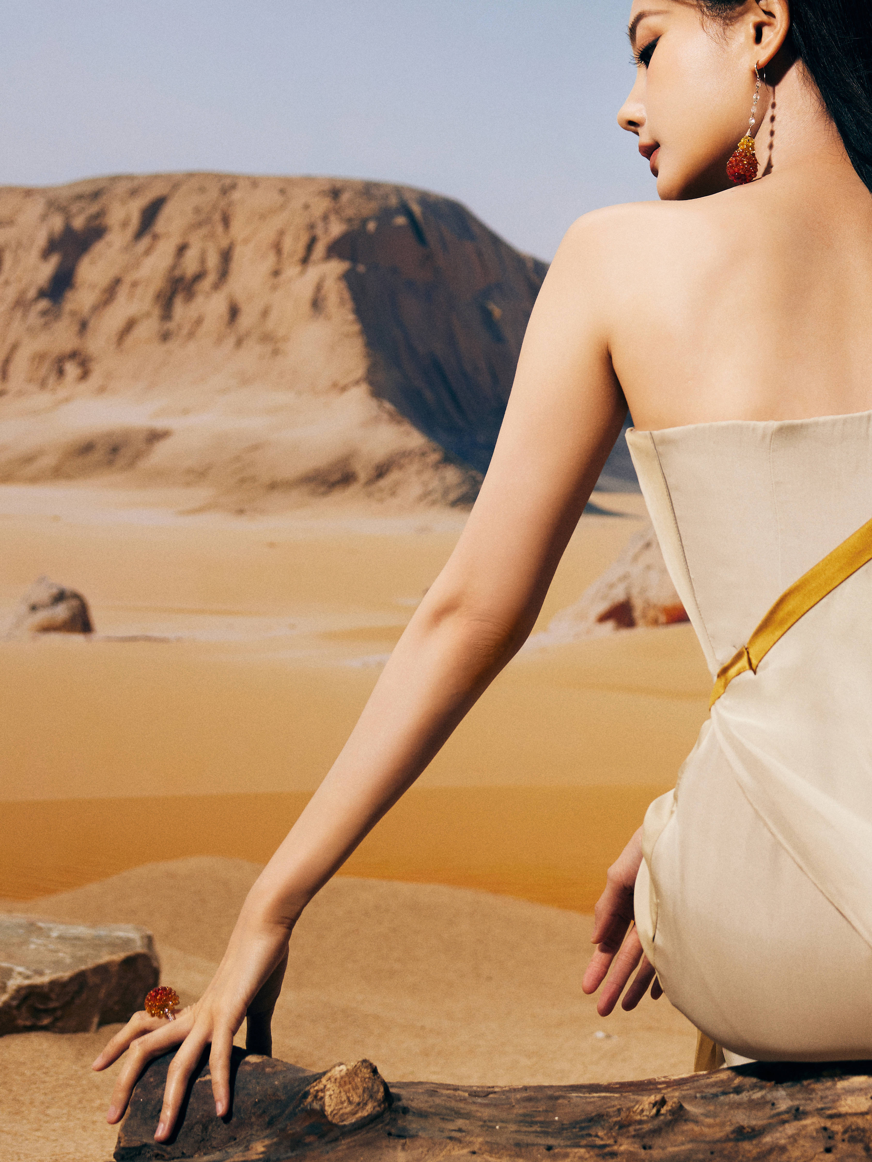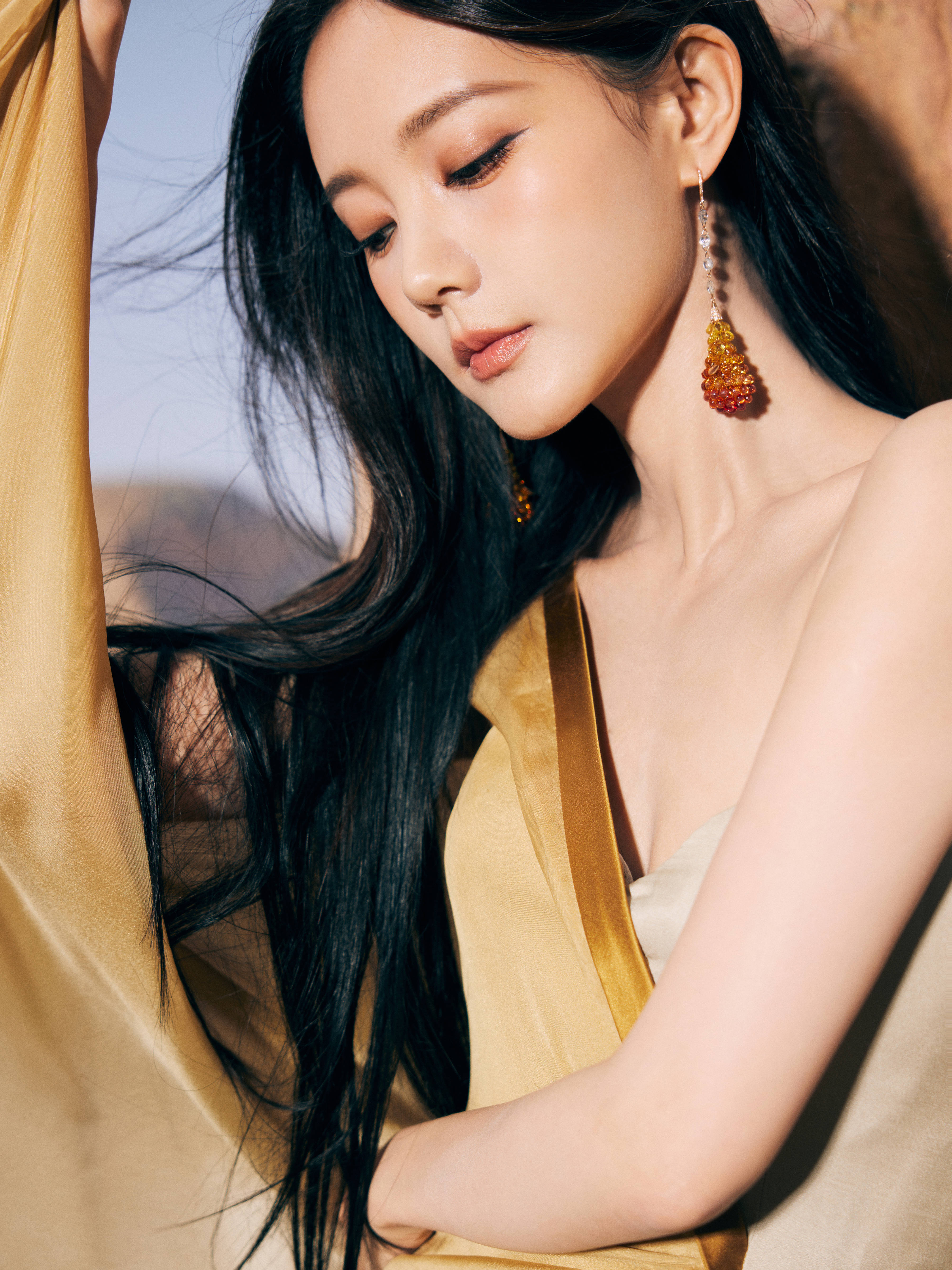 李一桐置身于塞外裸石山壁中,一身暗黄色礼裙与背景融合得非常协调。