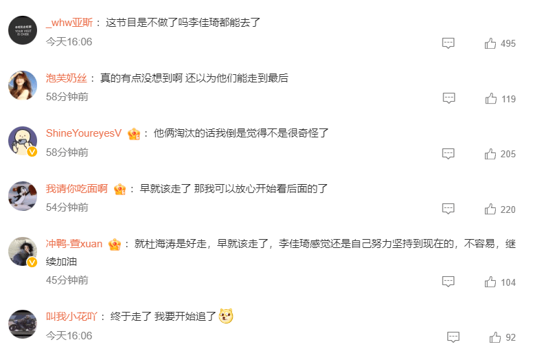 但是就在大家质疑看衰中,离家去杜海涛居然还一直在节目中晋级,估计连本人都觉得意外,之前其他艺人出局,不少网友就表示失望,觉得杜海涛李佳琦早该出局了。