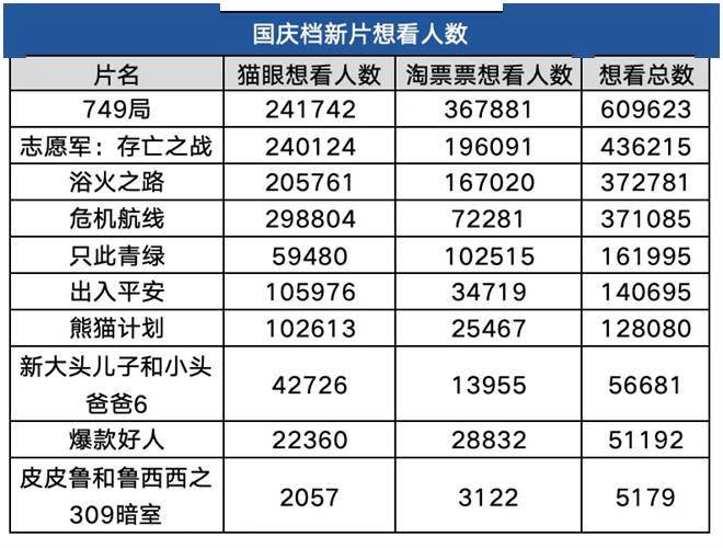 “想看人数”只是映前多项指标的其中一项,不能和上映后的票房、口碑画等号,其他几部国庆档新片同样各有特色和亮点。