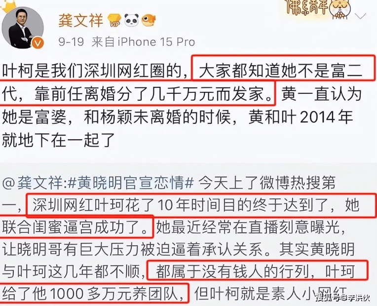 该博主称叶珂在深圳网红圈非常有名气,但她不是富二代,为了当上黄晓明的女朋友,她甘愿花十年时间,还自掏腰包给了黄晓明一千万才取得其信任,最后逼宫成功,杨颖下线她上线。