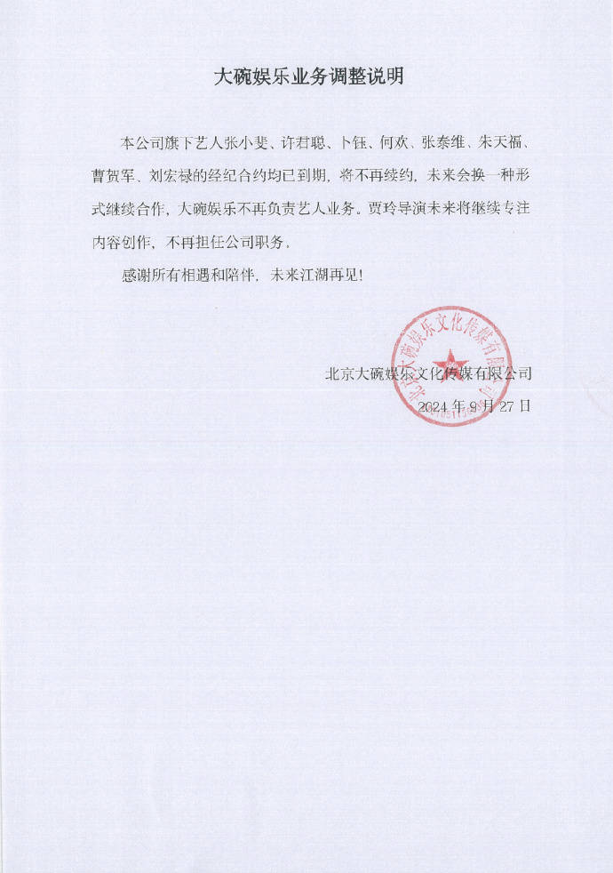 最近,大碗娱乐发布业务调整声明,称公司旗下艺人张小斐、许君聪、卜钰、何欢、张泰维、朱天福、曹贺军、刘宏禄的经纪合约已到期,将不再续约,未来会换一种形式继续合作。