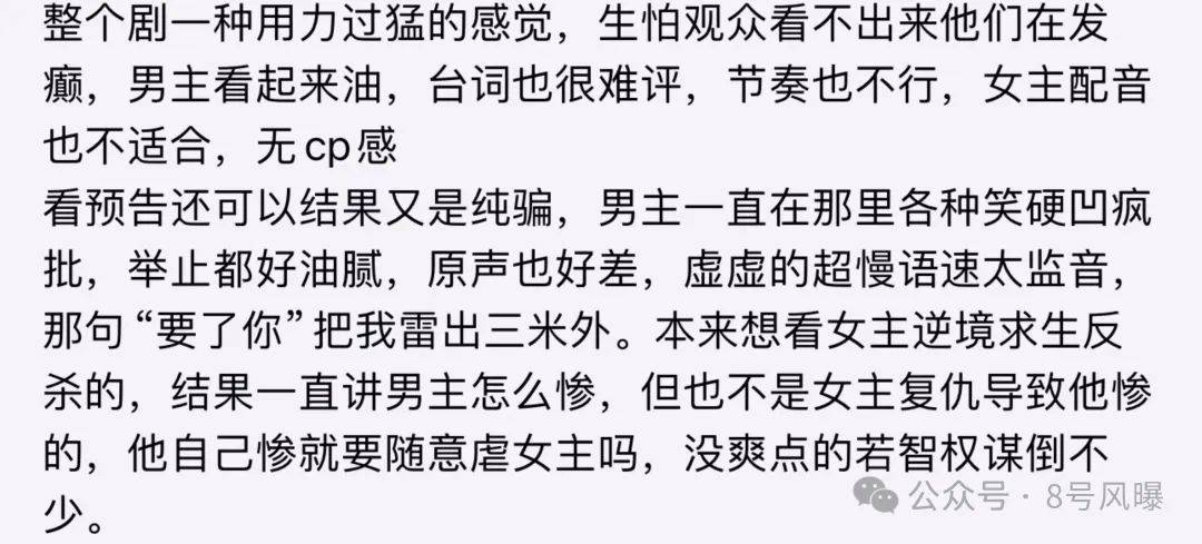 女主吴谨言有了《延禧攻略》和《墨雨云间》的红利后,总是演复仇的角色,让观众有些审美疲劳,而且她演这几部剧都是差不多的表情,所以大家会觉得她演啥都能演成一个样子。