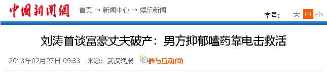 【4】中新网——《刘涛首谈富豪丈夫破产:男方抑郁嗑药靠电击救活》2013年02月27日
