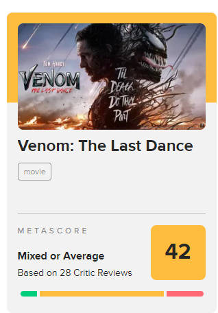 搜狐娱乐讯 《毒液:最后一舞》北美影评解禁开分,烂番茄新鲜度40%(63评25鲜38烂,对比前作新鲜度《毒液》30%,《毒液2》57%),MTC 42分(30评4好19中7差)。保持了该系列的一贯水平。内地昨日已上映。部分点评如下: