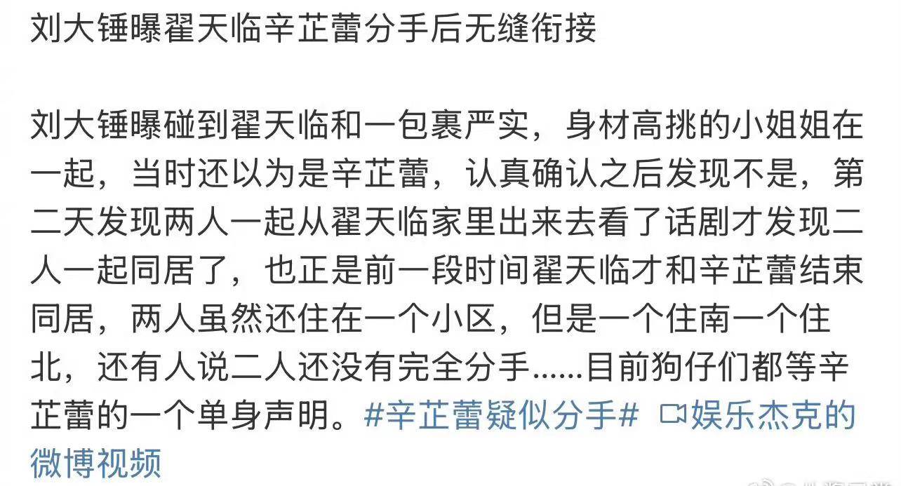 翟天临和辛芷蕾什么时候结束感情,看来狗仔也不是很清楚,但他们还住在同一个小区,一个住南一个住北,估计还没有彻底分手?期待辛芷蕾对这个报道有个回应。