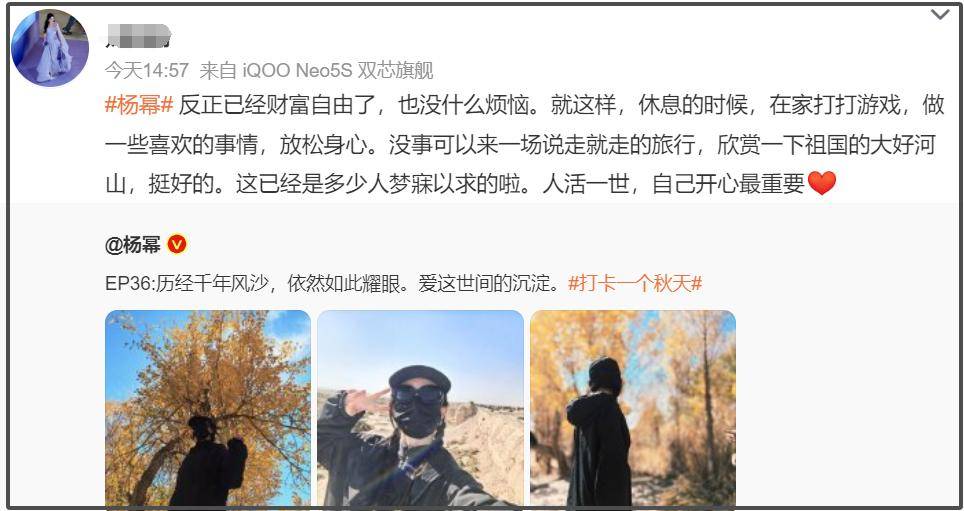 包括杨幂的粉丝,甚至都开始给杨幂留言,让她“人活一世,自己开心最重要”,面对杨幂发布的最新动态,留下一句:“反正已经财富自由了,也没什么烦恼……在家打打游戏,做一些喜欢的事情,放松身心。”