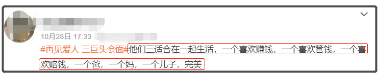 而在一些网友看来,他们三个人更适合在一起生活,杨子喜欢赚钱,麦琳喜欢管钱,刘爽喜欢赔钱,自私的爸,强势的妈,一个叛逆期的儿子,“三巨头”简直就是完美的结合。